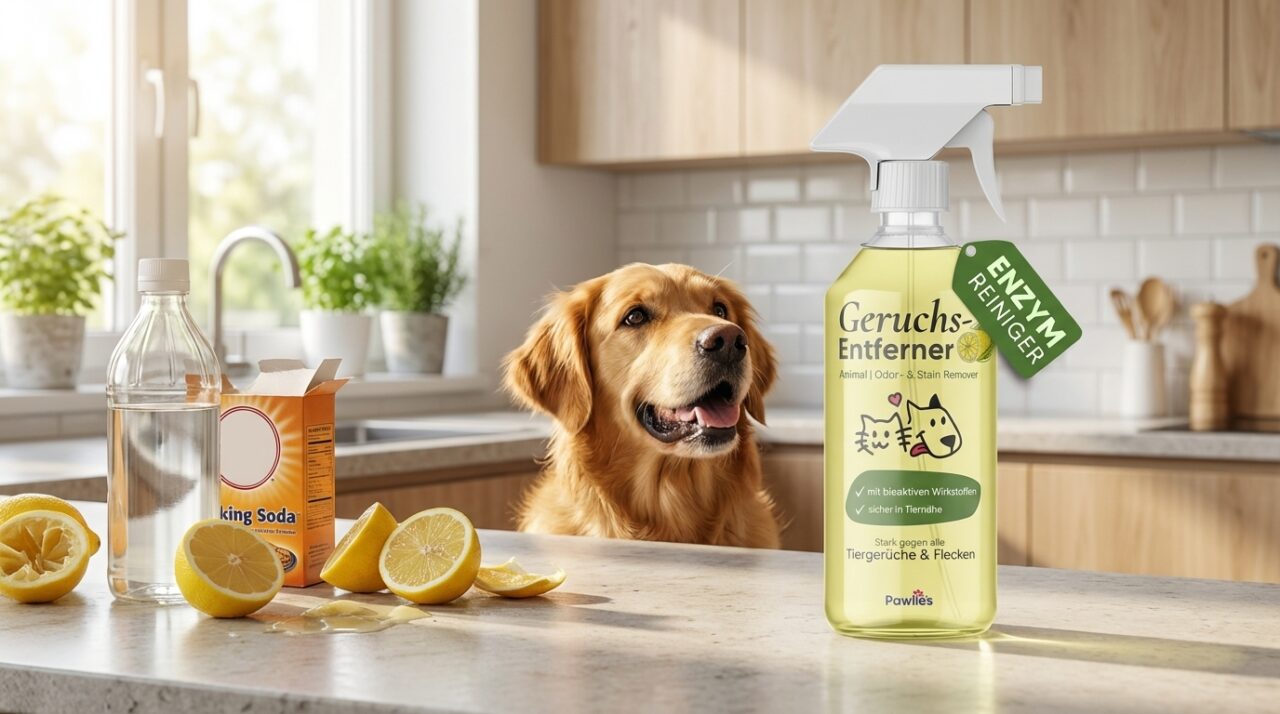 Ein Enzymreiniger ist ein biologisches Reinigungsmittel, das mithilfe von Enzymen organische Verschmutzungen wie Tierurin, Speichel oder Erbrochenes auf molekularer Ebene zersetzt und so Gerüche dauerhaft neutralisiert. Hausmittel wie Essig, Natron oder Zitronensaft überdecken Tiergerüche dagegen meist nur kurzfristig. Wenn dein Hund oder deine Katze mal wieder eine Duftmarke hinterlassen hat, greifen viele Tierbesitzer zuerst zu dem, was griffbereit ist. Doch nach ein paar Tagen kommt der Geruch zurück, manchmal sogar stärker als vorher. Woran liegt das? Und was hilft wirklich?
