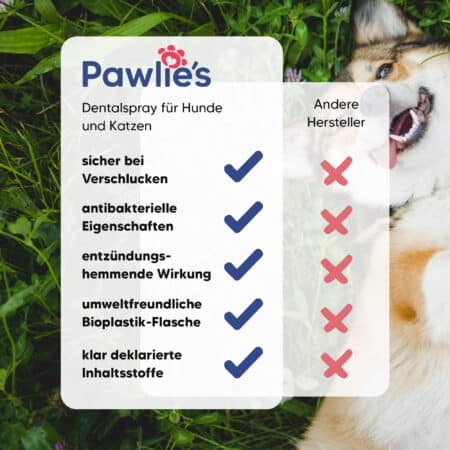 Anders als herkömmliche Hundezahnpasten oder Katzenzahnpasten, die oft schwer anzuwenden sind und von den Tieren abgelehnt werden, bietet Pawlie's Dentalspray eine einfache und stressfreie Anwendung. Einfach ins Maul sprühen und fertig – kein mühsames Zähneputzen oder kämpfen mit der Zahnbürste. Zudem sind die Inhaltsstoffe völlig sicher, selbst wenn sie von deinem Hund oder deiner Katze verschluckt werden. Frei von künstlichen Farbstoffen, synthetischen Zusatzstoffen und Alkohol, beinhaltet unser Spray Rindenextrakte der Purpur-Weide, die nachweislich effektiv gegen Zahnsteinbildung und unangenehmen Maulgeruch wirken.