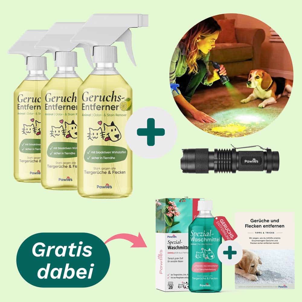 Das Geruchsentferner Detektiv Set kombiniert Enzymreiniger, Spezial-Waschmittel und UV-Detektor, um versteckte Tiergerüche gezielt aufzuspüren und tiefenwirksam zu beseitigen. Statt Gerüche zu überdecken, werden sie an der Ursache zerstört, ganz ohne aggressive Chemie oder Parfum.