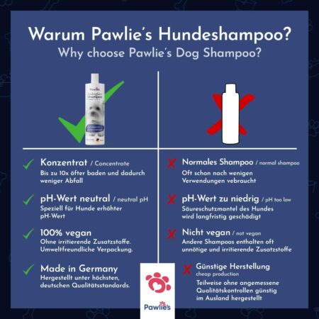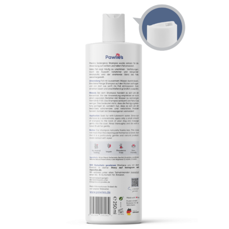 Bei Pawlie’s Samtweiß Hundeshampoo handelt es sich um ein hochkonzentriertes, veganes Shampoo, das sparsam in der Anwendung ist – schon ein kleiner Tropfen reicht für ein glänzendes Ergebnis. Es wird ohne Tierversuche in einer kleinen Manufaktur in Deutschland hergestellt und enthält keine Silikone, Parabene oder Paraffine.