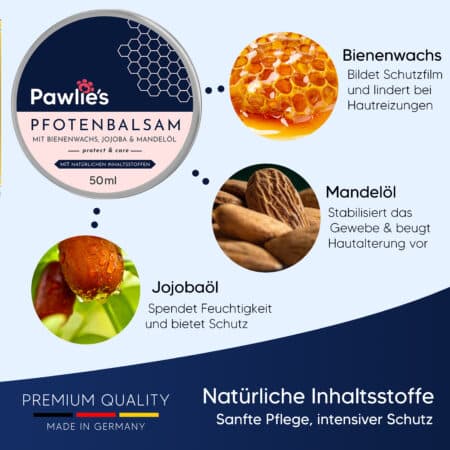 Die sehr ergiebige Pfotencreme mit Bienenwachs, Mandelöl und Jojoba-Öl kann täglich vor dem Spaziergang aufgetragen werden. Die pflegenden Öle heilen kleine Risse und Verletzungen und beruhigen so den Juckreiz. Zudem schützen sie vor Austrocknung und Umwelteinflüssen wie Schnee, Eis, Streusalz oder heißem Asphalt.